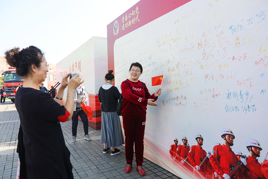 随后,全体消防指战员集体朗诵《沁园春 长沙》。饱含深情、铿锵有力的朗读声响彻整个橘子洲头,深深地感染了在场的每一名游客。“场面太震撼了,看到这些年轻的指战员们,我为祖国的强大感到自豪,为我们有这样的消防英雄而骄傲!”,现场观众跟随朗诵声挥舞小国旗,在活动主题展板上写下祝福话语。